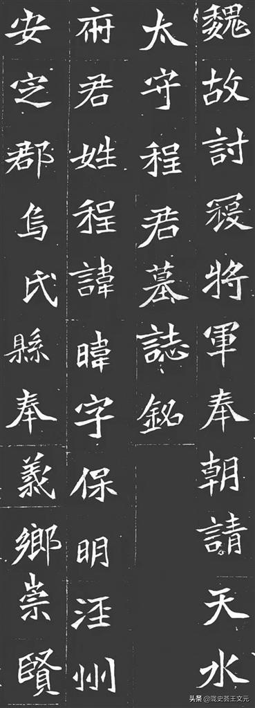 就書(shu)法(fa)來(lai)說,北(bei)魏(wei)(wei)《程暐墓(mu)(mu)志》也有很高的價值。這(zhe)方墓(mu)(mu)志,高58.7厘米,寬59.8厘米,刻18行,滿行18字,共309字。書(shu)法(fa)精(jing)整秀逸,格(ge)高力厚,為(wei)(wei)北(bei)碑中之神品(pin)。今人評述:以(yi)其(qi)與元顯儁(jun)相較(jiao),平正而(er)不偏(pian)頗,比之崔敬(jing)邑(yi),氣足而(er)力不弱。李(li)松先生有言:“學(xue)魏(wei)(wei)者或以(yi)此志為(wei)(wei)范可(ke)也!未必(bi)學(xue)魏(wei)(wei)必(bi)寫《始(shi)平公(gong)》《張猛龍》。”這(zhe)個(ge)墓(mu)(mu)志,可(ke)作為(wei)(wei)我們臨習楷書(shu)的上佳范本。