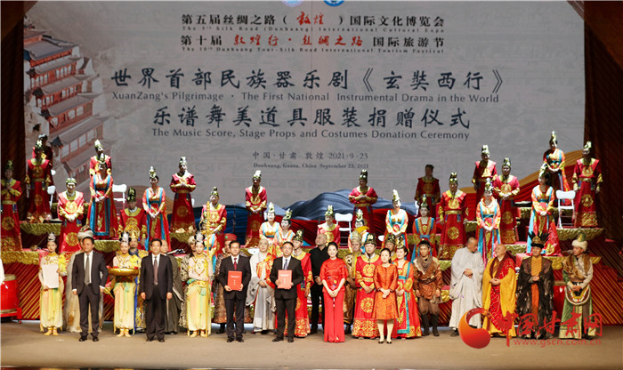 演(yan)(yan)出(chu)結束后,現場(chang)舉(ju)行了(le)簡潔(jie)而隆重的“大(da)(da)型(xing)民(min)(min)(min)族(zu)(zu)(zu)器樂(le)劇《玄奘西行》樂(le)譜舞美(mei)道具服裝捐(juan)贈(zeng)儀(yi)式”,中央(yang)民(min)(min)(min)族(zu)(zu)(zu)樂(le)團(tuan)將(jiang)價值360萬元的樂(le)譜、舞美(mei)、道具和(he)服裝捐(juan)贈(zeng)給甘肅演(yan)(yan)藝(yi)集團(tuan)歌(ge)舞劇院,并指(zhi)導甘肅省文(wen)(wen)(wen)藝(yi)院團(tuan)將(jiang)民(min)(min)(min)族(zu)(zu)(zu)器樂(le)劇《玄奘西行》打造成為弘揚(yang)絲路(lu)精神、推(tui)動絲路(lu)文(wen)(wen)(wen)化交流融合的經典(dian)劇目。中央(yang)民(min)(min)(min)族(zu)(zu)(zu)樂(le)團(tuan)作(zuo)為海內(nei)外規模(mo)最大(da)(da)、藝(yi)術(shu)最完備(bei)的綜合性國家級(ji)民(min)(min)(min)族(zu)(zu)(zu)音樂(le)表演(yan)(yan)團(tuan)體,對甘肅文(wen)(wen)(wen)藝(yi)事(shi)(shi)業和(he)地方樂(le)團(tuan)創(chuang)作(zuo)發(fa)展和(he)人才培養給予大(da)(da)力支持,為甘肅文(wen)(wen)(wen)藝(yi)事(shi)(shi)業發(fa)展做出(chu)了(le)重大(da)(da)貢獻。