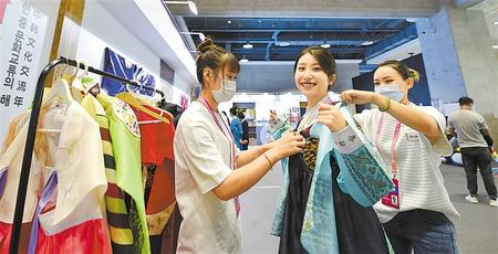 參觀者(zhe)感(gan)受韓(han)國傳統服飾。