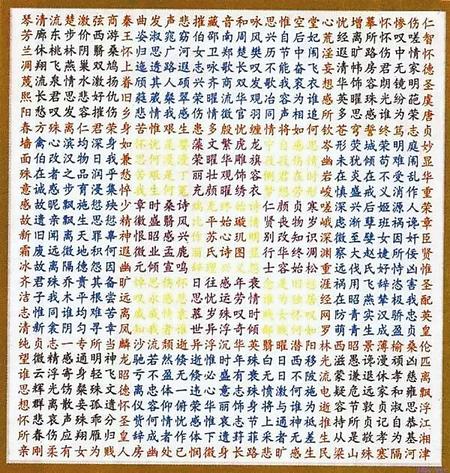 蘇蕙《璇璣(ji)(ji)圖》不僅是一束厚重的(de)文(wen)(wen)(wen)學(xue)奇葩,也(ye)是一幅(fu)充(chong)滿(man)創(chuang)(chuang)意(yi)的(de)藝術巨(ju)制。她將詩(shi)歌的(de)載體(ti)從傳(chuan)統(tong)簡帛紙張(zhang)轉換成為(wei)錦(jin)(jin)。錦(jin)(jin)是有(you)彩色花紋的(de)高級絲(si)織品。以(yi)錦(jin)(jin)為(wei)書寫材料制作《璇璣(ji)(ji)圖》,除詩(shi)歌本(ben)身的(de)創(chuang)(chuang)作外,首先需要(yao)染絲(si)紡織。錦(jin)(jin)織好后,又(you)要(yao)對(dui)《璇璣(ji)(ji)圖》謀(mou)篇布局,劃區設色,書詩(shi)于(yu)(yu)錦(jin)(jin),然后一針(zhen)一針(zhen)地(di)將它(ta)繡出來,變為(wei)回文(wen)(wen)(wen)錦(jin)(jin)字。那每一道(dao)工序,要(yao)求都(dou)極精細,不得有(you)半點疏忽,不然就會留下污(wu)點和遺憾(han)。蘇蕙集眾藝于(yu)(yu)一身,完美地(di)將其制作出來,體(ti)現(xian)了她的(de)綜合藝術才(cai)能。取名“璇璣(ji)(ji)(泛指北(bei)(bei)斗(dou))圖”,寓意(yi)它(ta)像(xiang)北(bei)(bei)斗(dou),可以(yi)旋轉地(di)讀(du)。它(ta)是在(zai)華美的(de)錦(jin)(jin)上,又(you)以(yi)五彩繽紛的(de)絲(si)線(xian)繡上《璇璣(ji)(ji)圖》,不僅顏色更(geng)加艷麗(li),而且(qie)那841個金(jin)玉(yu)珠璣(ji)(ji)般文(wen)(wen)(wen)字,展現(xian)的(de)令人眼花繚亂的(de)詩(shi)歌園地(di),更(geng)是前不見古人,后不見來者,比錦(jin)(jin)繡的(de)光彩更(geng)加耀眼奪目。