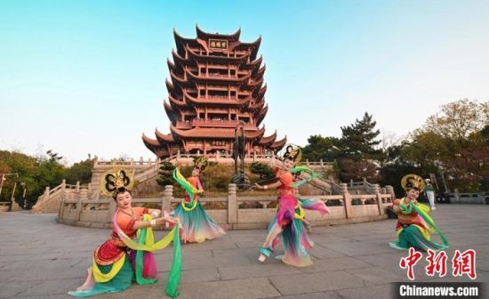 11月(yue)27日,伴著幽(you)幽(you)古樂(le),“飛天仙子(zi)”在“江南(nan)三大(da)名樓”之一的黃鶴樓前演繹敦(dun)煌舞。 甘(gan)肅省(sheng)文(wen)化和旅游廳供圖
