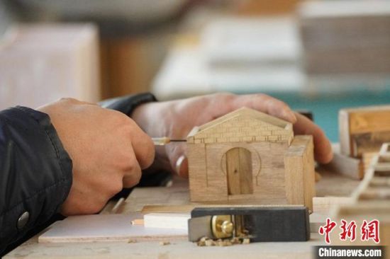 圖為古建筑模型(xing)工作室內(nei)工作人員正在制(zhi)作模型(xing)。 九美旦增(zeng) 攝