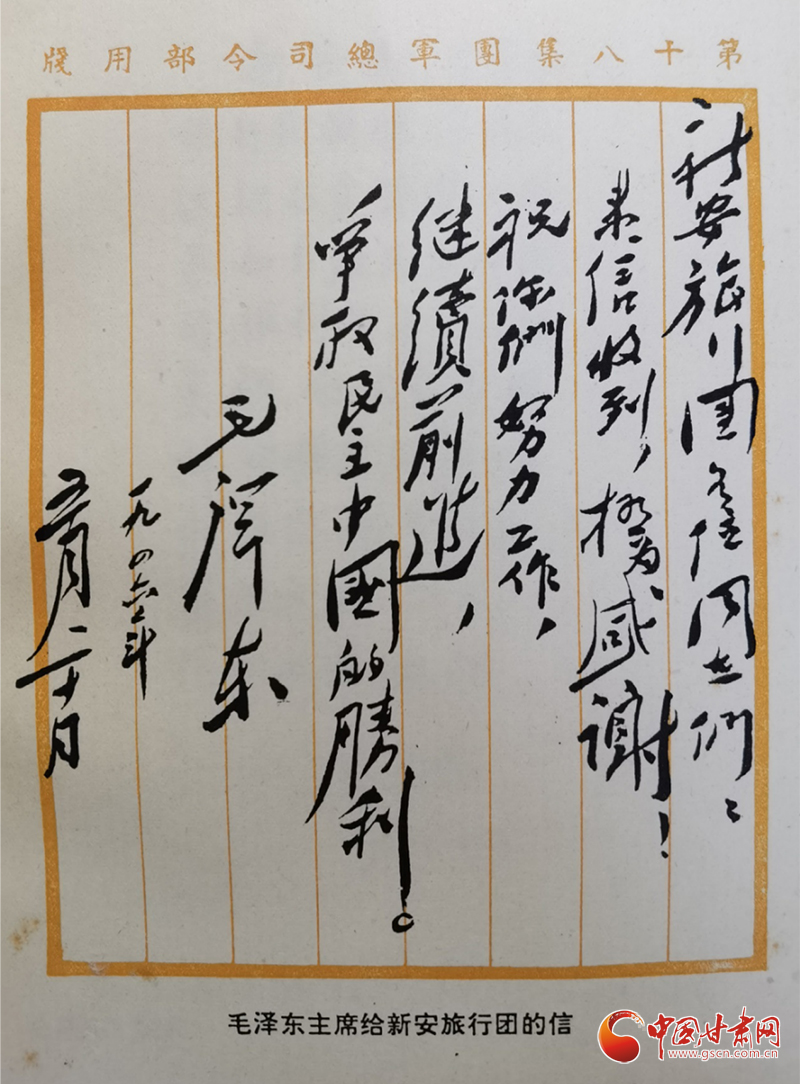 1946年(nian)5月20日(ri),毛(mao)澤東主席給新(xin)旅(lv)回信:“新(xin)安(an)旅(lv)行(xing)團(tuan)(tuan)各位(wei)同(tong)志們(men):來(lai)信收到,極為感謝!祝你(ni)們(men)努力(li)工作,繼(ji)續前進(jin),爭取民主中(zhong)(zhong)國(guo)的(de)(de)勝利。”時(shi)隔75年(nian)后的(de)(de)2021年(nian)5月30日(ri),習(xi)近平總書記給新(xin)安(an)小學(xue)的(de)(de)少先隊員們(men)回信:“當(dang)年(nian),在黨(dang)的(de)(de)關懷和領(ling)導下,‘新(xin)安(an)旅(lv)行(xing)團(tuan)(tuan)’不怕艱苦,足跡遍及(ji)大半個中(zhong)(zhong)國(guo),以文藝為武(wu)器(qi),喚起民眾抗日(ri)救亡,宣傳黨(dang)的(de)(de)主張(zhang),展現了愛國(guo)奮(fen)進(jin)的(de)(de)精神風貌(mao)。希望你(ni)們(men)結合自身成長實(shi)際學(xue)好黨(dang)史,以英雄模范人物為榜(bang)樣(yang),從(cong)小堅定聽(ting)黨(dang)話、跟黨(dang)走(zou)的(de)(de)決心,刻苦學(xue)習(xi),樹(shu)立理想,砥礪品格,增(zeng)長本領(ling),努力(li)實(shi)現德智(zhi)體美勞全面發展。”