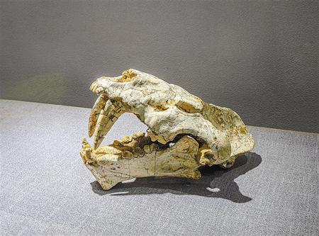 劍齒虎(hu)頭骨化(hua)石/晚中新世(shi)-更新世(shi)末 白銀市博物館(guan)藏