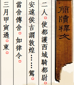 木(mu)簡(jian)(jian)1枚(出(chu)土編號:Ⅱ90DXT0213③:135),1990年出(chu)土于敦(dun)煌懸(xuan)泉置(zhi)遺(yi)址。長7.2、寬1.3、厚0.25厘米。木(mu)簡(jian)(jian)上殘,兩行(xing)書(shu)寫,字跡模糊(hu),難以(yi)(yi)辨識。簡(jian)(jian)文作(zuo)“二人(ren)。使(shi)都(dou)(dou)護西(xi)域(yu)騎都(dou)(dou)尉(wei)、安遠侯吉謂敦(dun)煌……駕,當舍傳舍,如律令。三月甲寅過,東。”。簡(jian)(jian)中“使(shi)都(dou)(dou)護西(xi)域(yu)騎都(dou)(dou)尉(wei)”是(shi)(shi)西(xi)域(yu)都(dou)(dou)護的(de)正(zheng)式官名(ming),“騎都(dou)(dou)尉(wei)”當指以(yi)(yi)本官都(dou)(dou)護西(xi)域(yu),是(shi)(shi)其本職,而“使(shi)”則突(tu)出(chu)了使(shi)職性質(zhi)。這是(shi)(shi)懸(xuan)泉置(zhi)記錄的(de)一份傳文書(shu),簡(jian)(jian)文不完整,大意是(shi)(shi)說某年三月甲寅日,西(xi)域(yu)都(dou)(dou)護鄭吉派(pai)遣的(de)使(shi)者自西(xi)向(xiang)東行(xing),懸(xuan)泉置(zhi)依傳律規定,為停駐的(de)兩名(ming)使(shi)者提(ti)供了飲(yin)食。該簡(jian)(jian)文對(dui)研究懸(xuan)泉置(zhi)的(de)傳舍制度,以(yi)(yi)及西(xi)漢(han)王朝對(dui)西(xi)域(yu)行(xing)使(shi)管轄提(ti)供了重要的(de)原始資料。現藏甘肅(su)簡(jian)(jian)牘博物館。