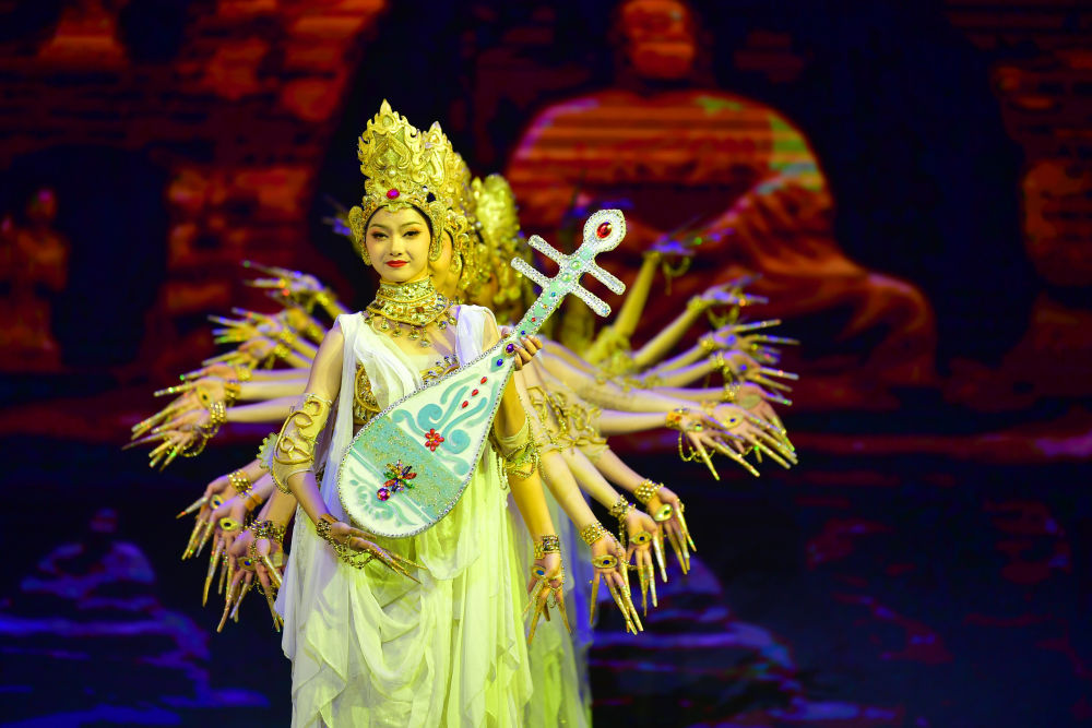 2021年9月24日,第五屆絲綢(chou)之(zhi)路(lu)(敦(dun)煌)國際文化博(bo)覽會和第十屆敦(dun)煌行·絲綢(chou)之(zhi)路(lu)國際旅游節在甘肅(su)省敦(dun)煌市開(kai)幕。圖片為演員在開(kai)幕式(shi)上演出。新華社(she)記者陳斌 攝