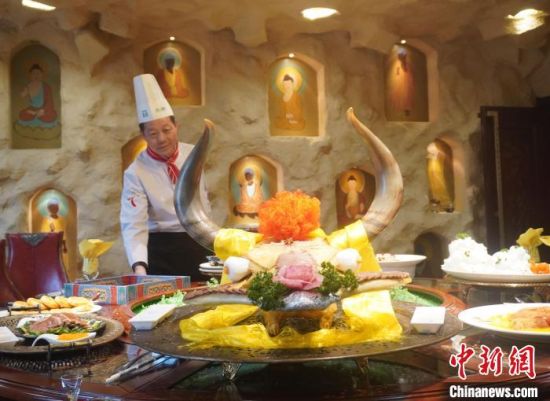 位于蘭州主城區一家名為“敦煌盛宴”的餐廳內,模仿莫高窟洞窟外形裝修,繪飾敦煌壁畫,如此讓食客身臨其境。“九色鹿”“月牙泉”“絲路駝鈴”和“敦煌舞袖湯”等包含敦煌元素的古代佳肴悉數被端上餐桌。