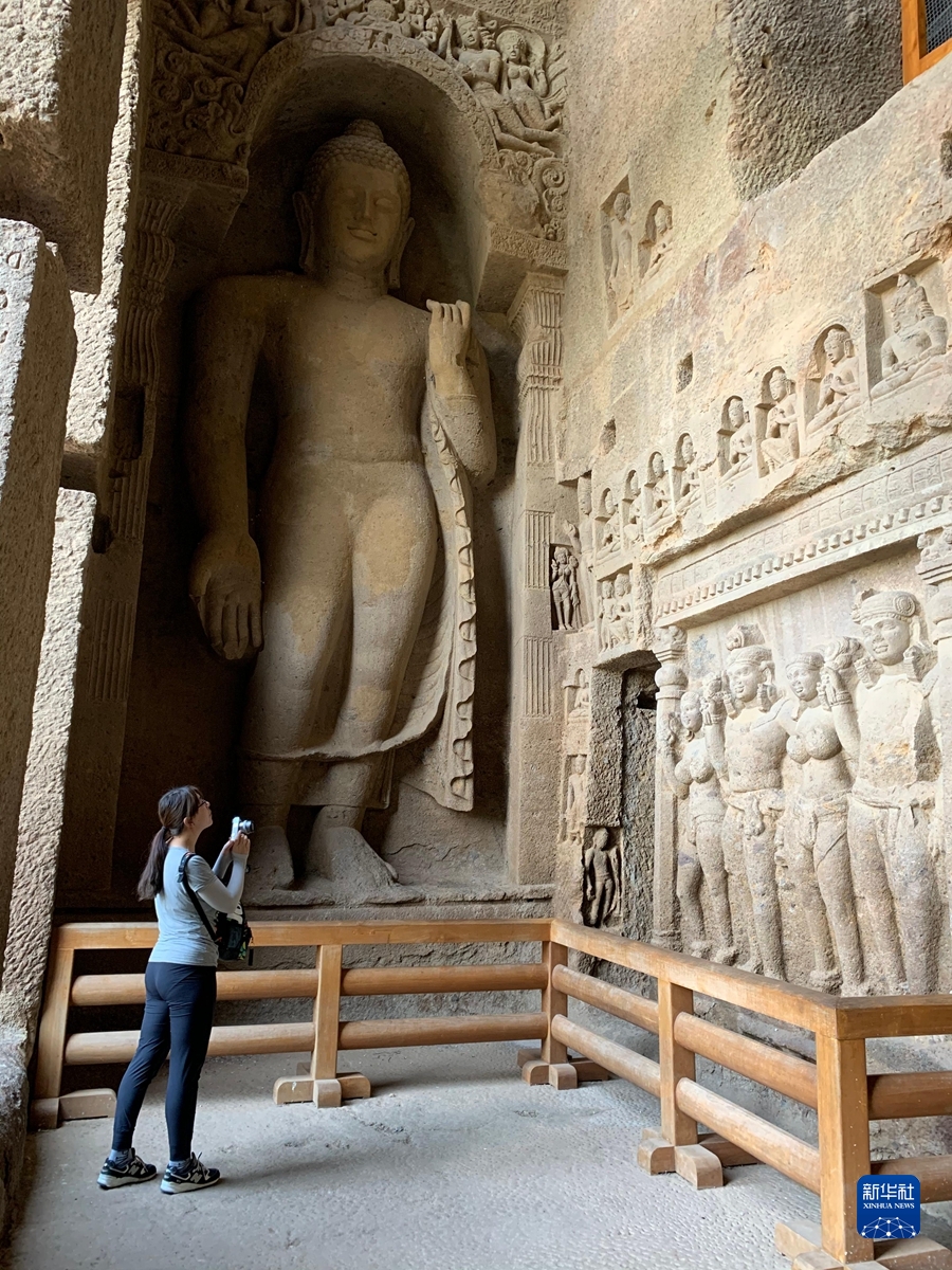 2019年11月,王嬌在印度一石窟記錄圖像資料。新華社發(受訪者供圖)