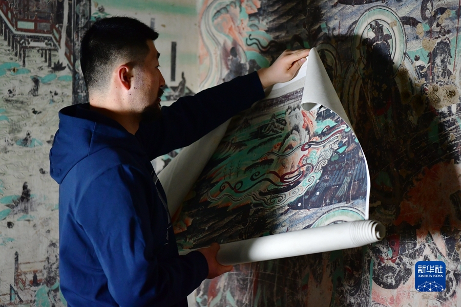 4月19日,在莫高窟第172窟,劉小同在對比臨摹壁畫的細節。新華社記者 杜哲宇 攝