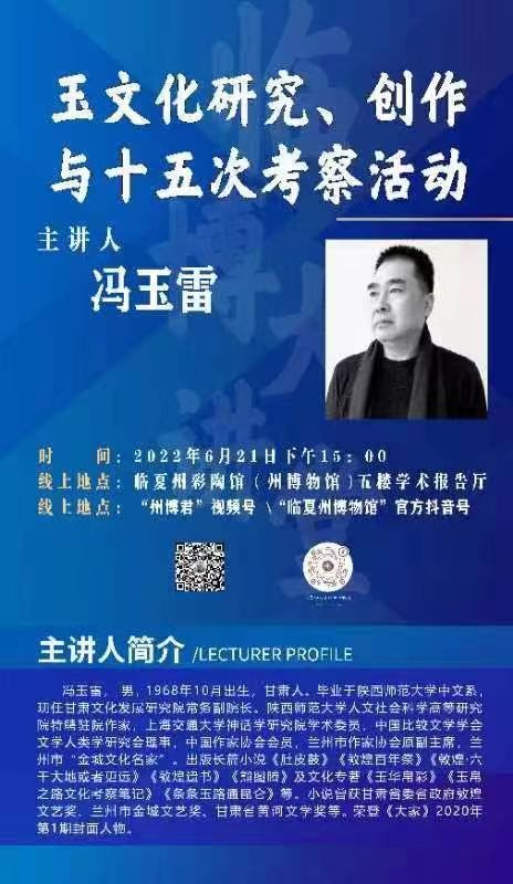 為認真貫徹落實省第十四次黨代會精神,進一步弘揚中國玉文化和民族精神,推動玉文化傳承及玉文化文創產業發(fa)展。6月21日下午,甘肅文化發展(zhan)研究(jiu)院常務副院長馮玉(yu)雷受邀在臨夏州彩陶館(州博(bo)物館)學術報告廳作了題(ti)為《玉(yu)文化研究(jiu)、創作與十五(wu)次考察活(huo)動》的學術講(jiang)座。