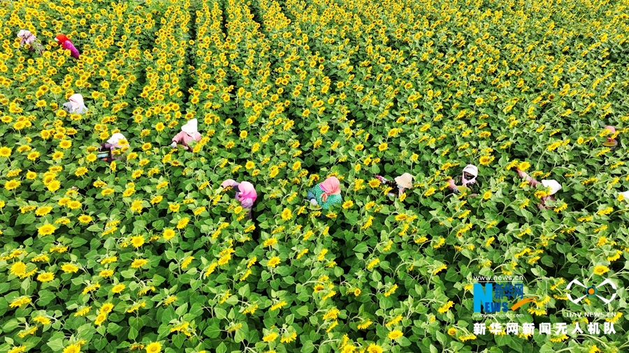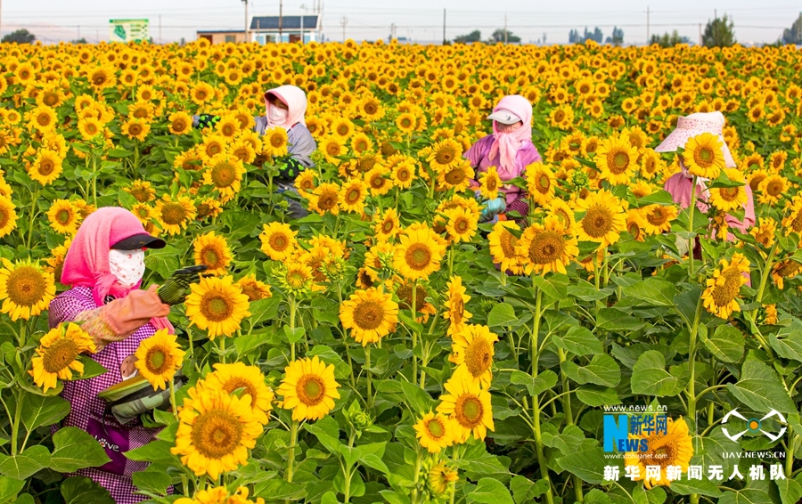 7月23日,甘肅省張掖市臨澤縣新華鎮長莊村近千畝制種向日葵盛開,金色花海里數十名葵農忙著為向日葵授粉。新華網發(成林 攝)