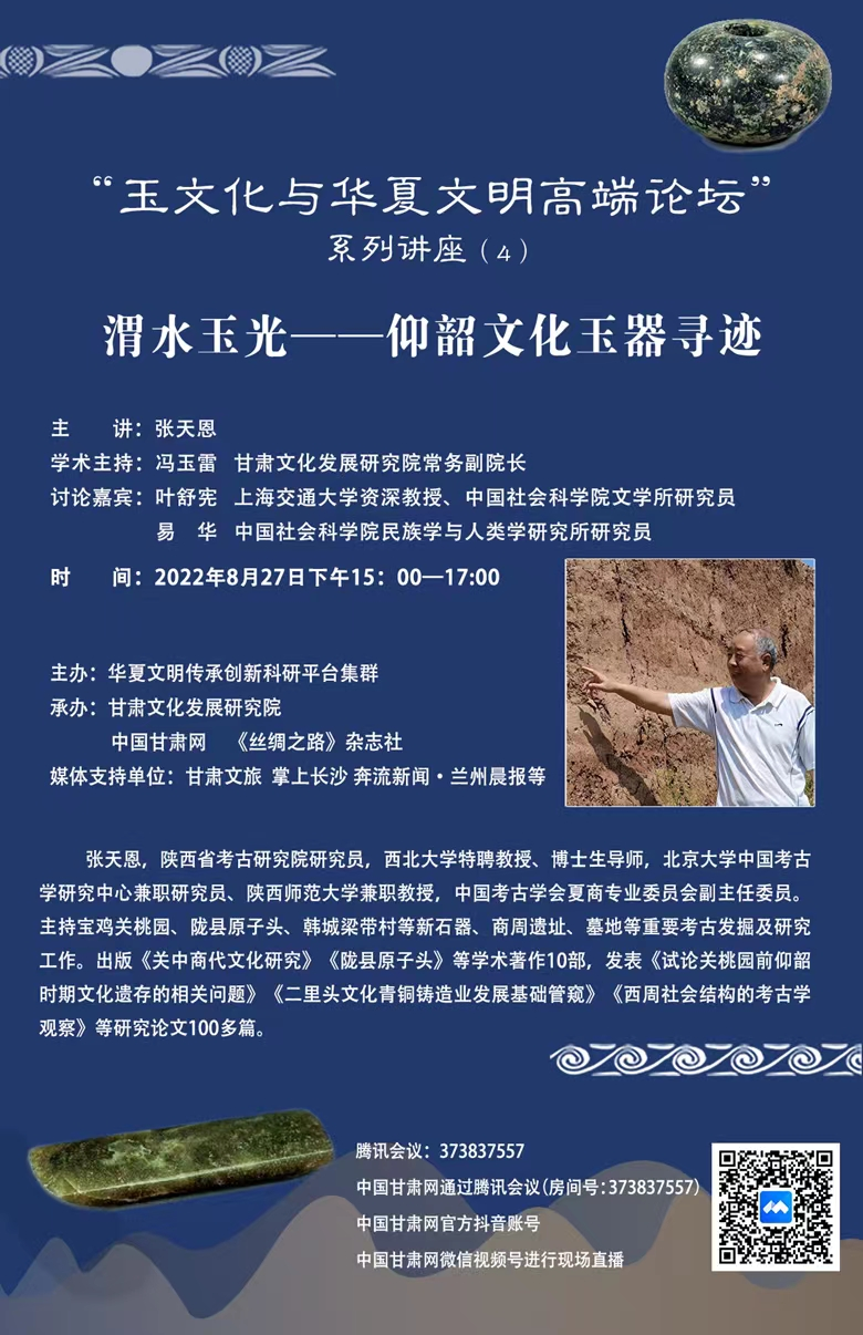 中國甘(gan)肅網8月28日(ri)訊(xun) 27日下(xia)午15:00—17:00,由西北師范大(da)學華夏文明傳承(cheng)(cheng)創新科研(yan)平臺集群主辦,甘(gan)(gan)肅文化發展研(yan)究院、中(zhong)國甘(gan)(gan)肅網、《絲綢之路》雜志社聯合承(cheng)(cheng)辦的“玉文化與(yu)華夏文明高端論壇”第四(si)講(jiang)《渭水玉光——仰韶文化玉器尋跡》成功舉辦。