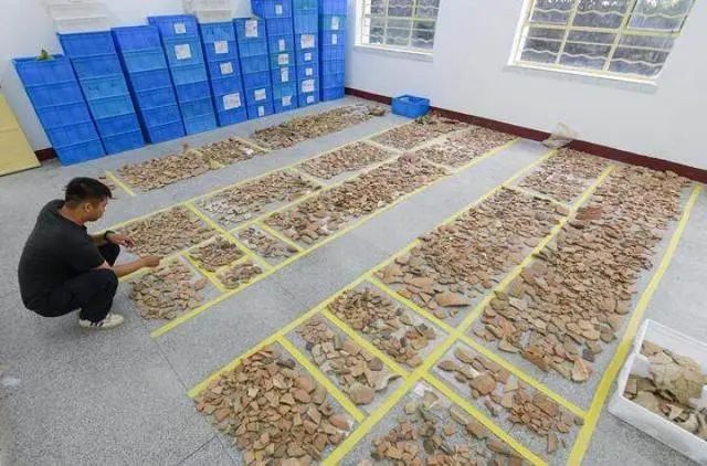 考(kao)古工作人員在南佐(zuo)遺(yi)址(zhi)研究基地整理出土的大量陶片(8月(yue)25日攝)。新(xin)華社記者 李賀 攝