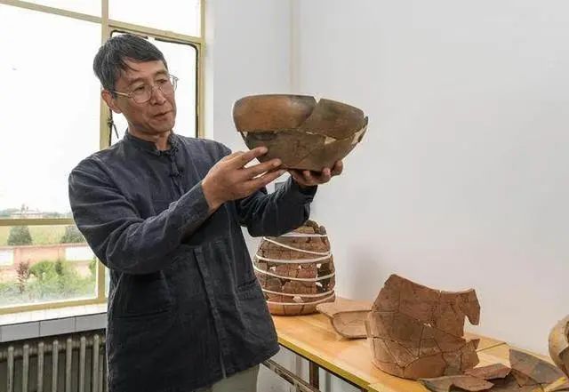 南佐遺址聯合考(kao)古隊領隊、中(zhong)國人民大學歷(li)史學院考(kao)古文(wen)博系教授韓建(jian)業在遺址研究基(ji)地內展示出土(tu)的陶器(qi)(8月23日攝)。新(xin)華社記者 李(li)賀 攝