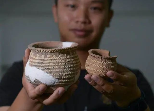 考古工(gong)作(zuo)人員在展示遺址內出土的箍(gu)白(bai)泥附加堆(dui)紋夾砂陶(tao)罐(8月25日攝(she)(she))。新華社記者 李賀 攝(she)(she)