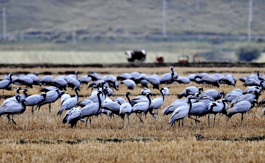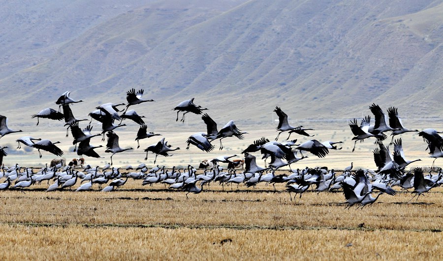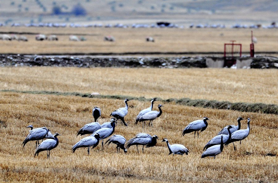 人民網(wang)蘭州10月10日電 (記者高翔(xiang))寒(han)露至(zhi)、候鳥遷(qian),甘(gan)肅省肅南裕固族自治縣皇城(cheng)鎮夏日塔拉草(cao)原(yuan)迎來數(shu)千只(zhi)蓑羽鶴,它們在濕地的水面(mian)上、草(cao)叢(cong)中或悠(you)閑(xian)覓食、或蹁躚起舞,與(yu)色彩斑斕的草(cao)原(yuan)構成了一幅和諧優美的生態(tai)畫卷。