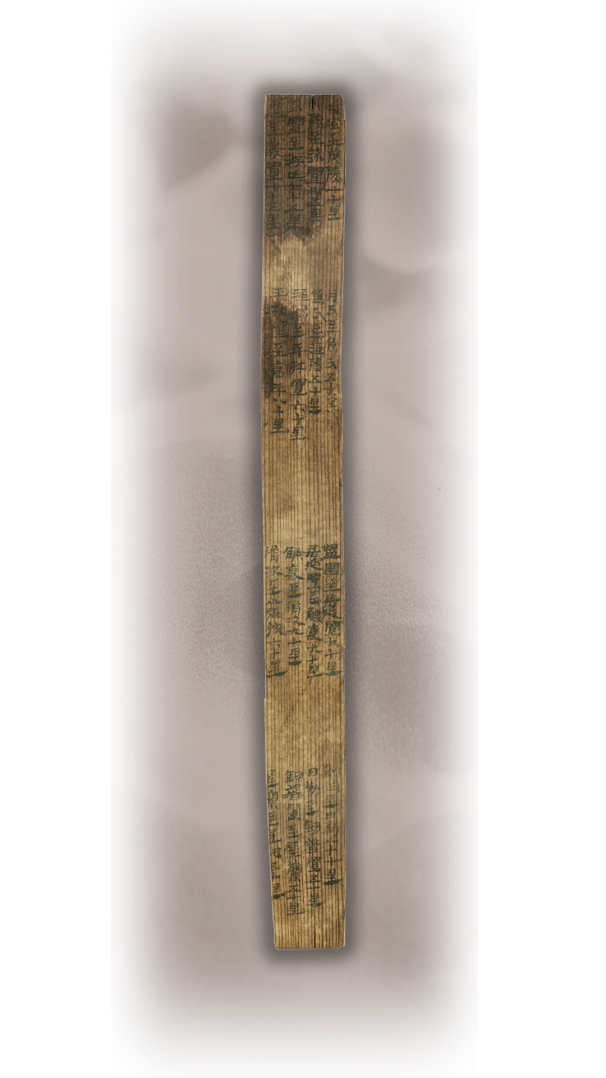 居延里程簡,漢(han)代,國(guo)家一級文物,發現于(yu)1974年(nian),出土(tu)于(yu)居延破城子(zi)遺(yi)址。簡為松(song)木制作,長22.9厘米(mi),寬2.1厘米(mi),通簡從上至下分(fen)四欄,每欄從右(you)至左分(fen)四行(列(lie))抄寫(xie),計17行,地縣驛置名20個。