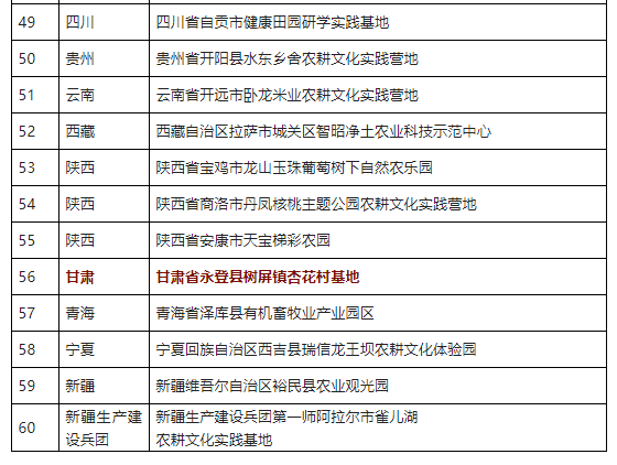 日前,農業農村部、共青團中央、全國少工委組織開展了農耕文化實踐營地推薦工作。經過逐級推薦、材料審查、專家評審和網上公示,全國農業展覽館(中國農業博物館)等60個單位為農耕文化實踐營地,甘肅省永登縣樹屏鎮杏花村基地入選。