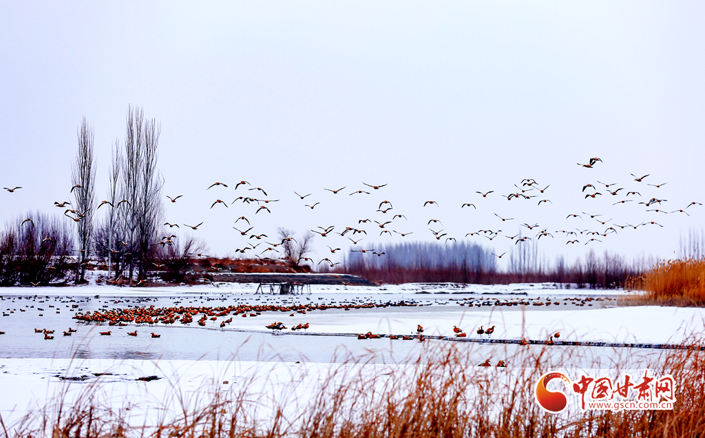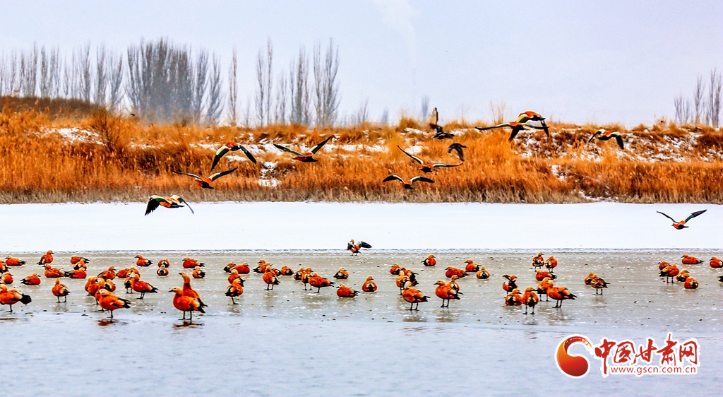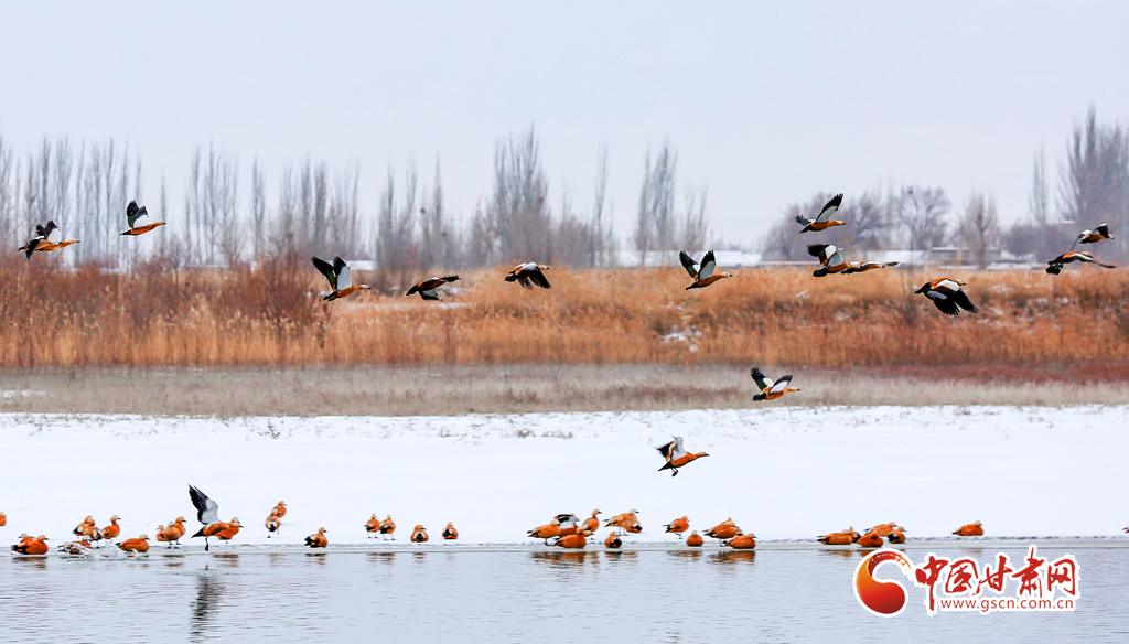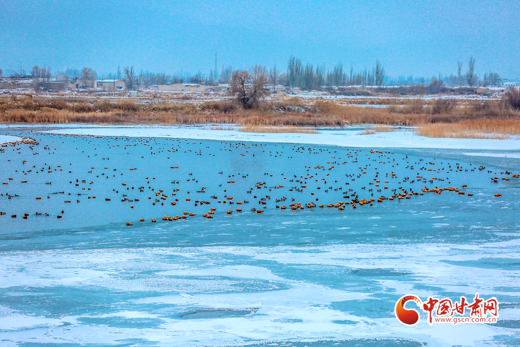 12月20日,在甘肅省酒泉市銀達鎮花(hua)園(yuan)水庫,一群候鳥正在戲水、覓食,為(wei)祁連(lian)山下的戈壁大地(di)增添了(le)一道亮(liang)麗的景色。