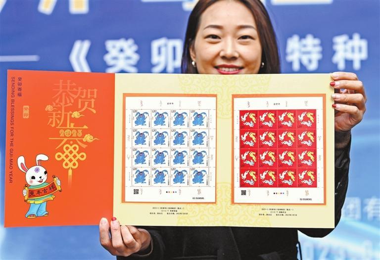 中國甘肅網1月6日訊 據蘭(lan)州晨(chen)報報道(奔流(liu)新(xin)聞·蘭(lan)州晨(chen)報記者王思璇)1月5日,中(zhong)國(guo)(guo)郵政發行《癸(gui)卯年(nian)》特種郵票(piao)1套(tao)(tao)2枚,圖(tu)案內(nei)容(rong)分(fen)別為:癸(gui)卯寄福、同圓共(gong)生(sheng),這套(tao)(tao)特種票(piao)是中(zhong)國(guo)(guo)生(sheng)肖(xiao)郵票(piao)第(di)四輪中(zhong)的第(di)八(ba)套(tao)(tao)。同日,《癸(gui)卯年(nian)》特種郵票(piao)在蘭(lan)州市各集郵營(ying)業網點發售。