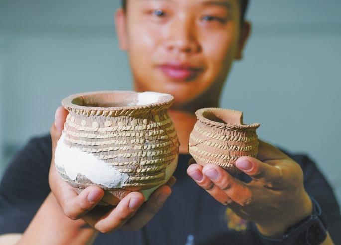 考古工作人員(yuan)展示南佐新石器時代遺址內(nei)出土的箍白泥(ni)附加(jia)堆紋夾砂(sha)陶(tao)罐。