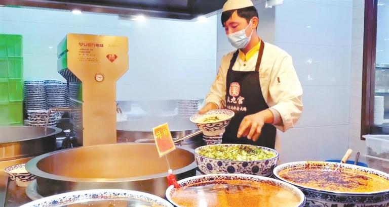 上午9時許,在酒泉路中山林國保牛肉面館里,收票員小馬和拉面師高師傅正默契地配合著,馬師傅靦腆地說:“我剛開始從事收票員這個工作時,也會記不住顧客要什么面型,就得反復問顧客,可這一耽誤就導致拉面師傅不能及時將顧客的面拉好下鍋,所以我就強迫自己死記硬背,幾年來,每天重復收票、喊票的工作,慢慢地記憶就提升了,熟能生巧。”