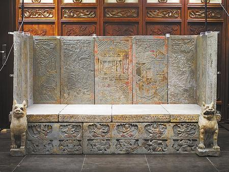 1982年6月,天(tian)水(shui)(shui)市(shi)在(zai)城區(qu)南(nan)山石(shi)馬(ma)坪修建水(shui)(shui)利工程時發現一(yi)座古(gu)墓(mu),經(jing)天(tian)水(shui)(shui)市(shi)文(wen)化館工作人員現場清(qing)理和(he)(he)隨后(hou)調查研究,發現是一(yi)座隋唐時期(qi)的墓(mu)葬(zang),出土一(yi)具圍屏(ping)石(shi)榻和(he)(he)一(yi)組隨葬(zang)品。該石(shi)榻為(wei)砂頁巖(yan),通高1.23米(mi)、寬1.15米(mi)、長2.18米(mi),由(you)(you)床(chuang)(chuang)(chuang)(chuang)座、床(chuang)(chuang)(chuang)(chuang)板、素(su)面石(shi)條和(he)(he)屏(ping)風(feng)等26塊組成(cheng)。床(chuang)(chuang)(chuang)(chuang)座正面由(you)(you)兩塊石(shi)板組成(cheng),分上下兩層,稱壸門,上層雕(diao)刻(ke)6個樂伎(ji)俑,分別是執(zhi)笙俑、執(zhi)銅鈸俑、彈琵琶俑、吹(chui)簫俑、手擊腰鼓(gu)俑、彈奏箜篌俑。下層壸門刻(ke)6個神獸,兩臂生翼,反掌托舉。床(chuang)(chuang)(chuang)(chuang)板為(wei)4方石(shi)板,子(zi)母(mu)扣相接,正面床(chuang)(chuang)(chuang)(chuang)沿刻(ke)有(you)(you)連珠忍冬紋(wen)并貼金(jin)彩繪。屏(ping)風(feng)由(you)(you)11方高87厘米(mi)、寬30厘米(mi)-46厘米(mi)貼金(jin)彩繪畫像石(shi)組成(cheng),其中,正面5方,兩側面各3方,底部鑲(xiang)嵌于床(chuang)(chuang)(chuang)(chuang)板邊(bian)沿凹槽(cao)。雕(diao)刻(ke)的主(zhu)要內容(rong)有(you)(you)可(ke)能是墓(mu)主(zhu)人生前生活的情景,以中國(guo)古(gu)典園林建筑為(wei)主(zhu)調。同時出土的還有(you)(you)一(yi)方墓(mu)志銘、5個座式(shi)樂伎(ji)俑和(he)(he)雞首壺、燭臺、金(jin)釵、石(shi)枕、銅鏡各一(yi)件。