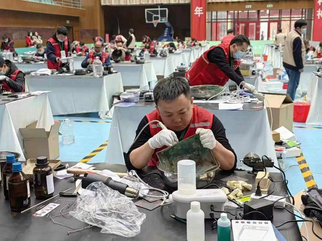 金(jin)屬(shu)文(wen)物修復選(xuan)(xuan)手面(mian)對不(bu)同形(xing)(xing)狀、不(bu)同年代、不(bu)同用途和不(bu)同殘破程度(du)的(de)文(wen)物,修復過程需要選(xuan)(xuan)手對文(wen)物實際(ji)情況進行全面(mian)了解,采取相應(ying)的(de)修復措施,并保(bao)證文(wen)物安全。甘肅省選(xuan)(xuan)手張偉抽到的(de)修復文(wen)物是一件變形(xing)(xing)嚴重且帶有缺(que)(que)失花紋的(de)青銅(tong)簋,他對整體變形(xing)(xing)的(de)青銅(tong)簋進行逐步(bu)矯正,并對缺(que)(que)失的(de)紋飾進行補配(pei)粘(zhan)接(jie),最終將一件精(jing)美的(de)文(wen)物呈現在(zai)評委面(mian)前。