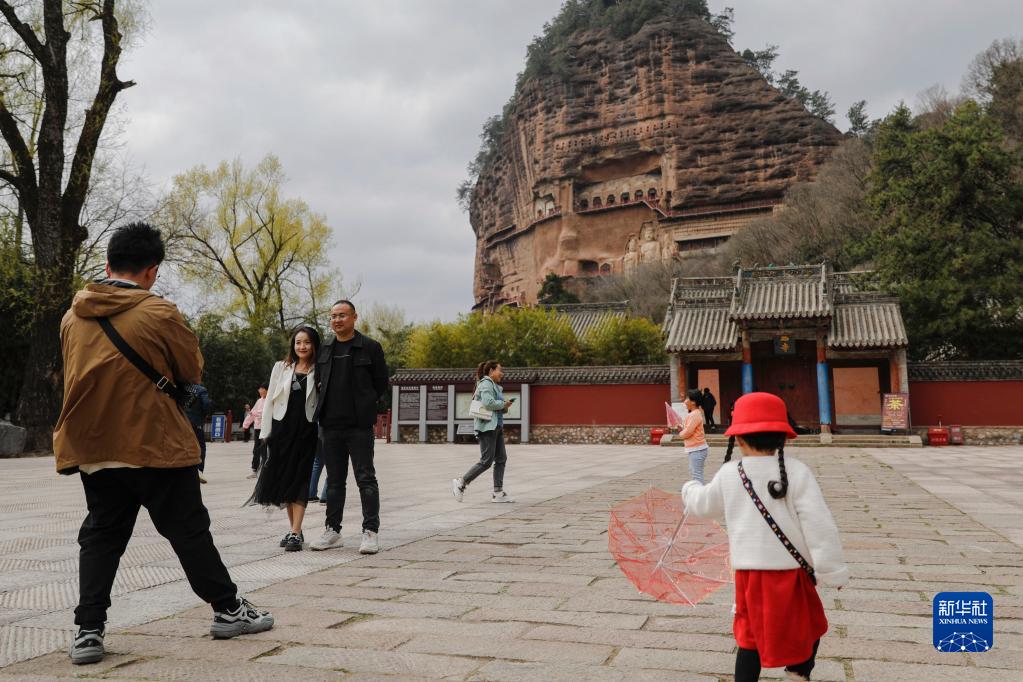 4月1日,游客在麥積山石窟游玩。新華社記者 王鵬宇 攝