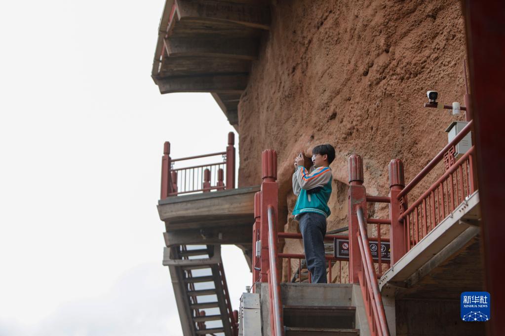 4月1日,游客在麥積山石窟拍照留念。新華社記者 李杰 攝