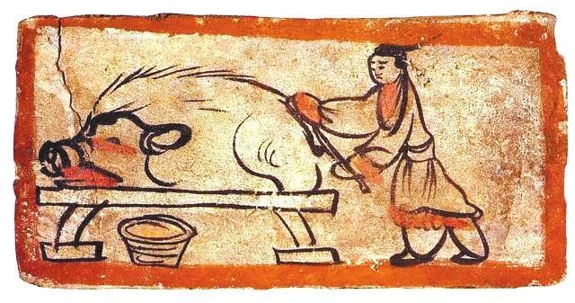 墓(mu)磚壁畫描述(shu)古人宰豬場景(jing)。