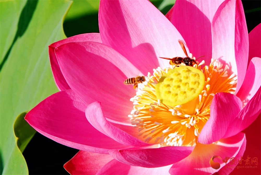 偶有(you)蜜蜂立于荷花枝頭,在陽(yang)光(guang)下展現(xian)出別樣風采