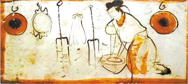 嘉峪關(guan)新(xin)城三號墓曾出土一塊畫(hua)像磚,圖為(wei)女子(zi)在盆中揉(rou)面,后面的墻上掛著鐺、箕等廚具。