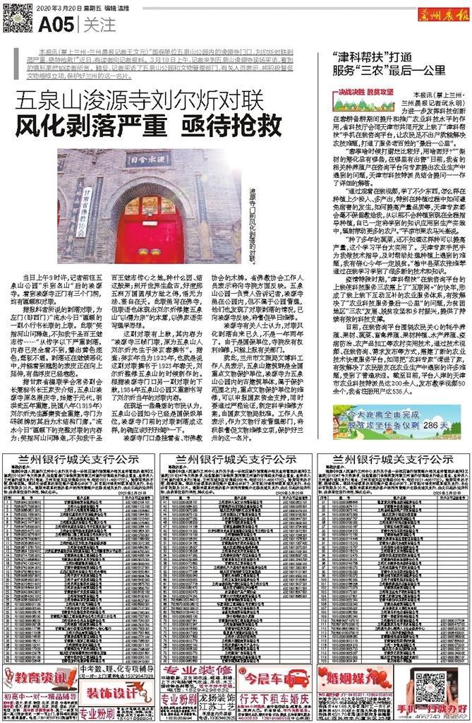 2020年3月20日《蘭州晨報(bao)》刊登呼(hu)吁(yu)搶救五泉山(shan)劉爾炘對聯(lian)的報(bao)道。
