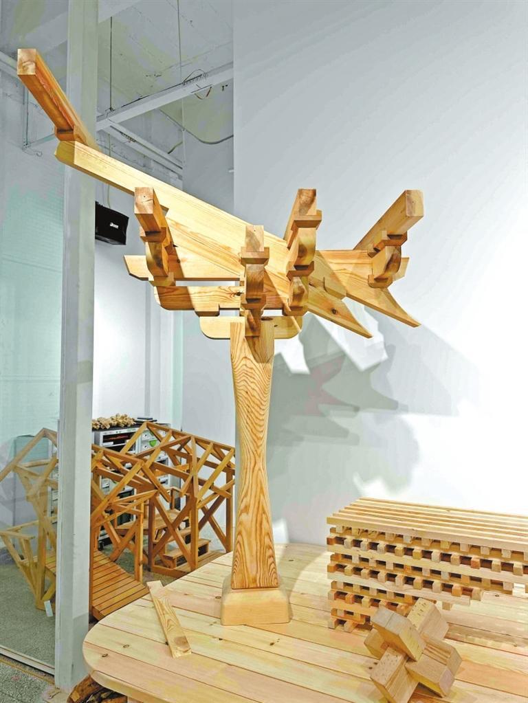 眼前,記者看到一件榫卯結構的(de)建(jian)筑作品氣勢(shi)不凡(fan)。