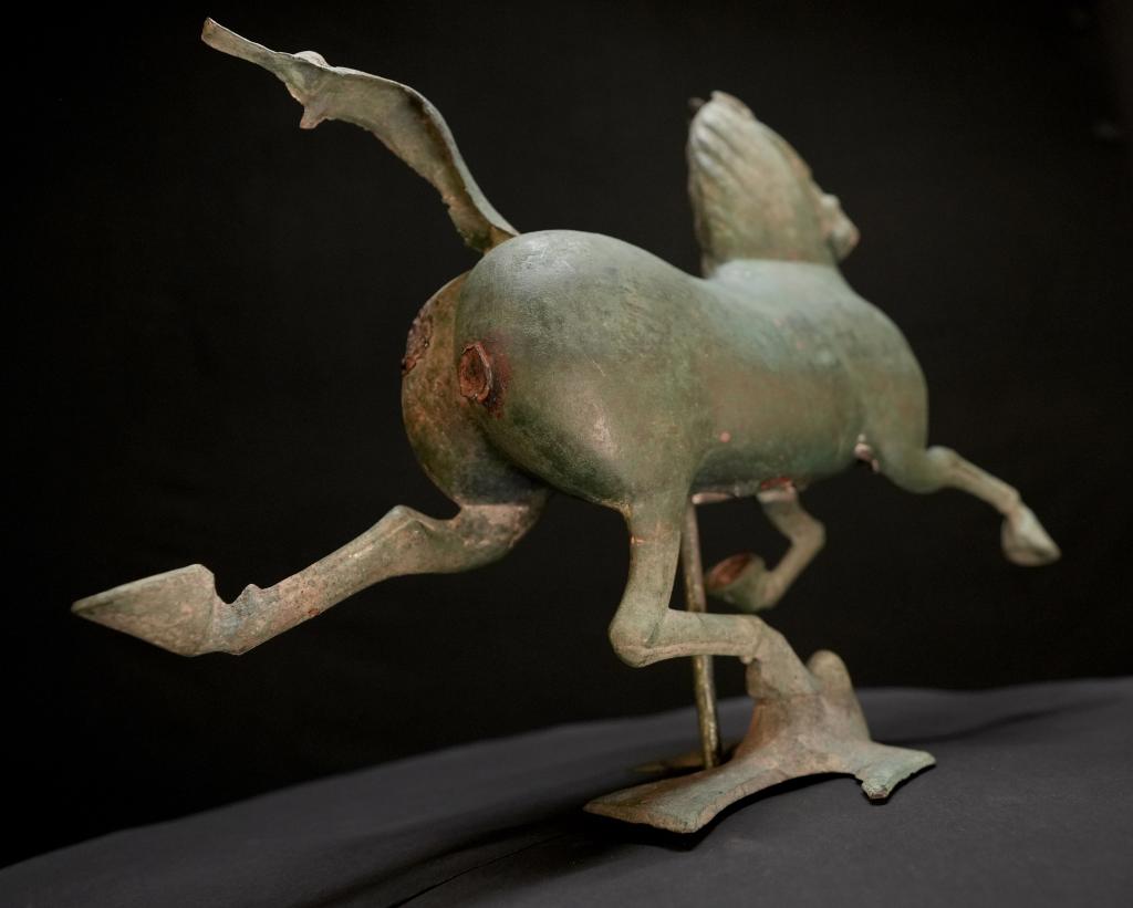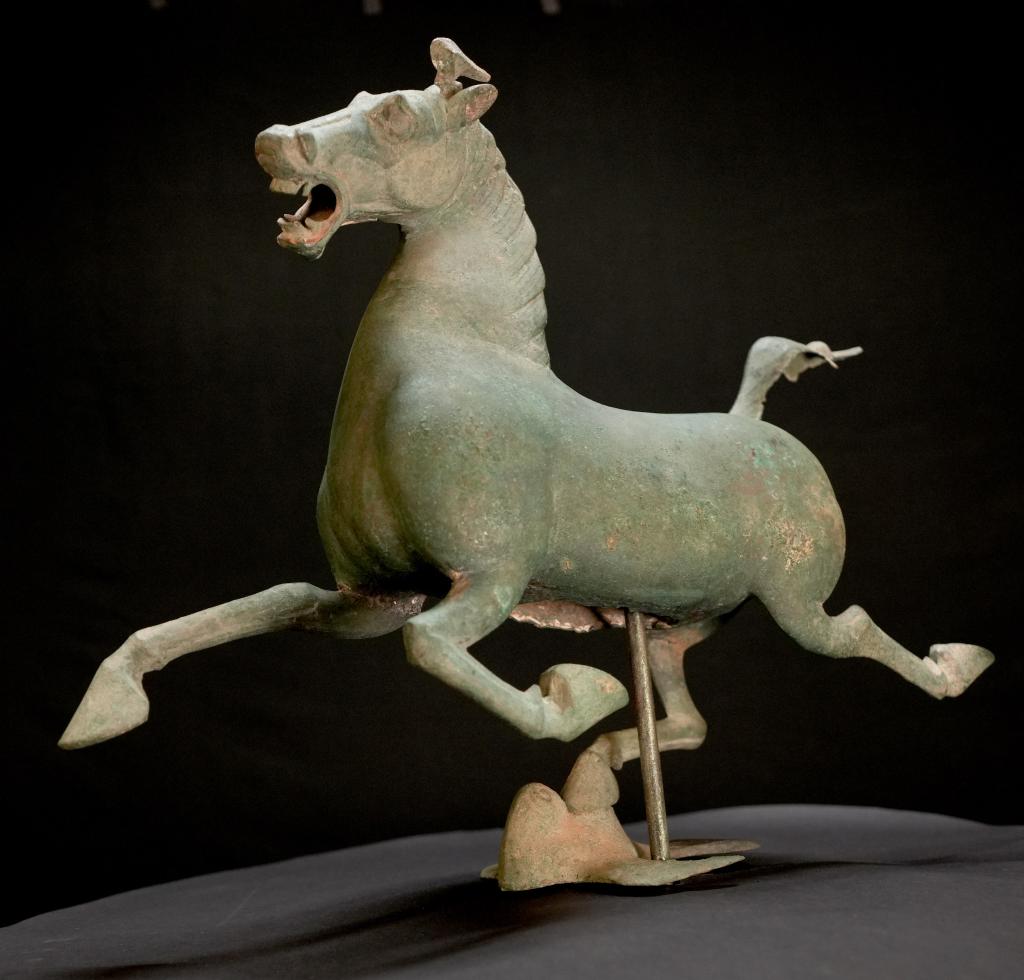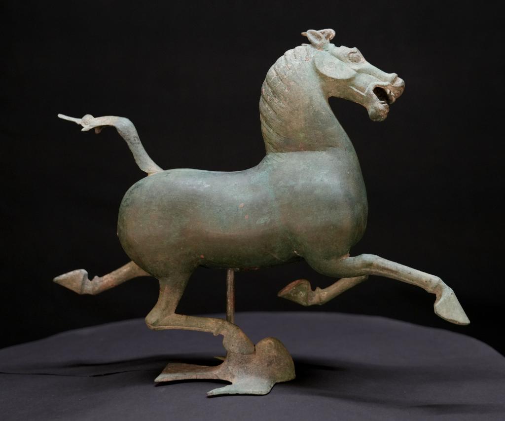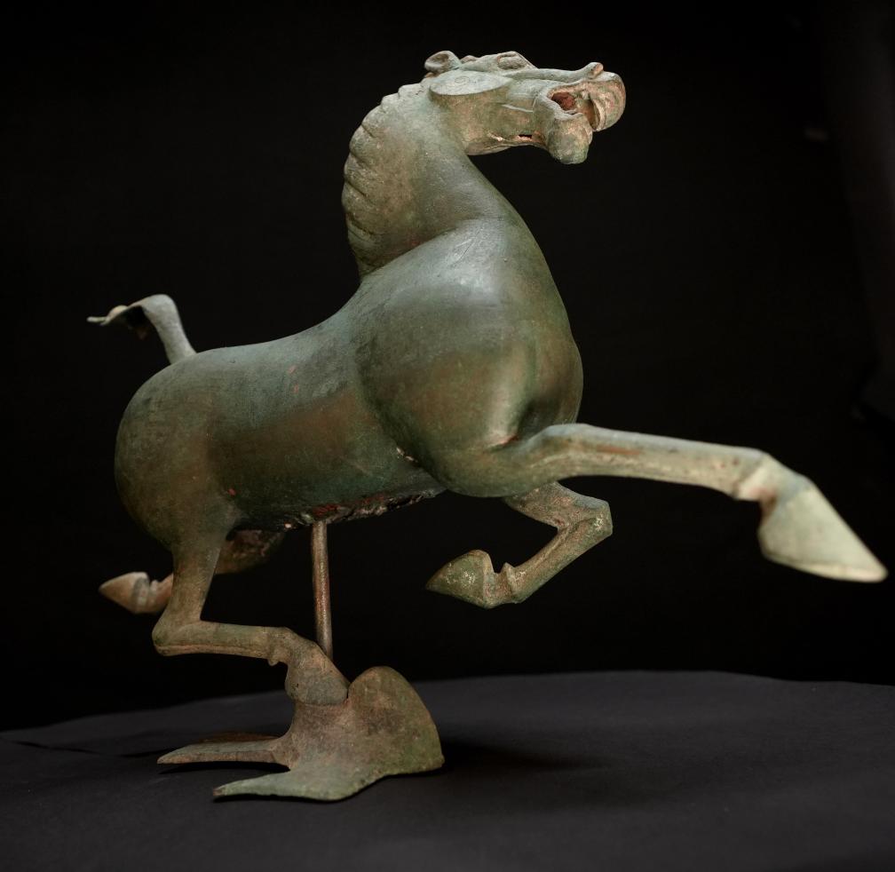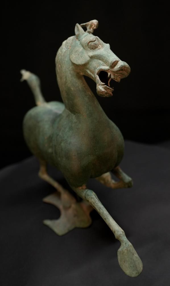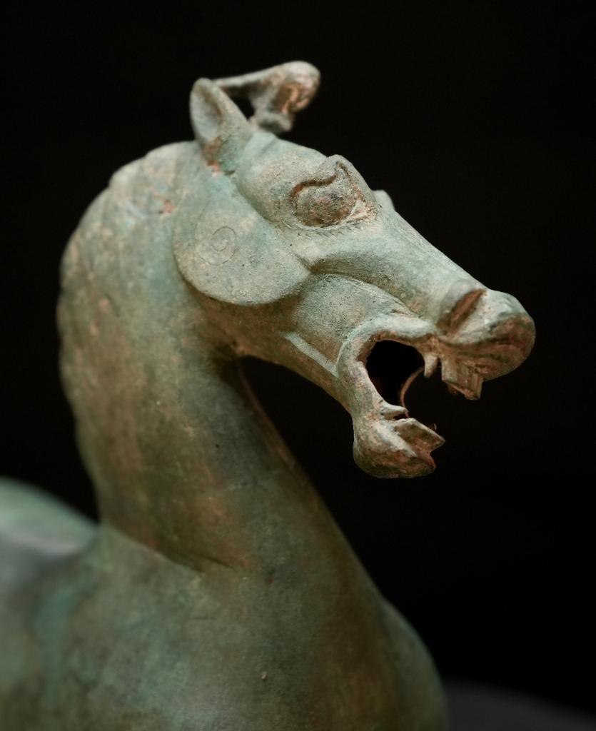 馬(ma)(ma)兒(er)(er)如(ru)在空中(zhong)飛馳,一足踏上飛鳥(niao)的(de)剎(cha)那,飛鳥(niao)回首驚顧。細細觀之(zhi)(zhi),馬(ma)(ma)的(de)口、眼、鼻均張(zhang)開,鬃毛和(he)尾絲(si)后揚,令人(ren)仿若聽見馬(ma)(ma)兒(er)(er)奔騰(teng)的(de)嘶鳴和(he)風嘯聲,靜態的(de)青(qing)銅器充滿靈動之(zhi)(zhi)感。