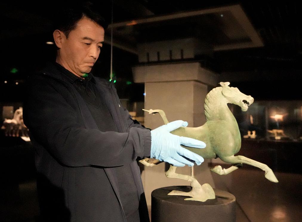 工作人(ren)員在甘肅省博(bo)物館展(zhan)廳內(nei)安放銅(tong)奔馬(2023年10月(yue)27日攝(she))。新華社記者 王毓(yu)國 攝(she)