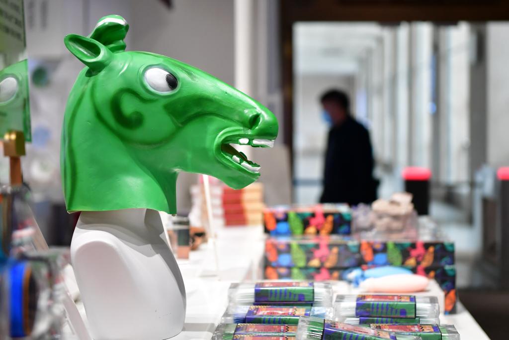 在甘(gan)肅省博物館文創商(shang)店拍攝的(de)(de)以銅奔馬(ma)為(wei)主題設計的(de)(de)“綠馬(ma)頭(tou)套(tao)”(2022年5月13日攝)。新華社記(ji)者(zhe) 陳(chen)斌 攝