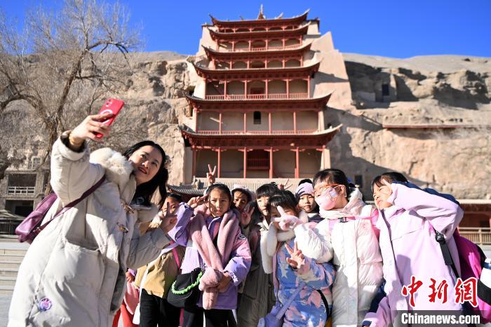 敦煌文化研學正逐步成(cheng)為(wei)(wei)敦煌旅(lv)游新時尚,莫(mo)高窟(ku)成(cheng)為(wei)(wei)“研學養身(shen)養心(xin)”的(de)(de)學堂(tang)之(zhi)一。連日來,中新社記(ji)者來到(dao)冬日的(de)(de)莫(mo)高窟(ku),沒(mei)有了夏日的(de)(de)人聲鼎沸和如長龍的(de)(de)隊(dui)伍,多了更多青春面孔(kong),穿(chuan)著(zhu)絢麗服飾、背著(zhu)書包的(de)(de)學生,點綴著(zhu)沉悶的(de)(de)戈壁土黃色。
