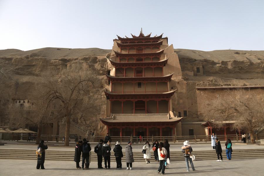 1月14日,游客在甘肅敦煌莫高窟游覽。新華社發(張(zhang)曉亮攝)