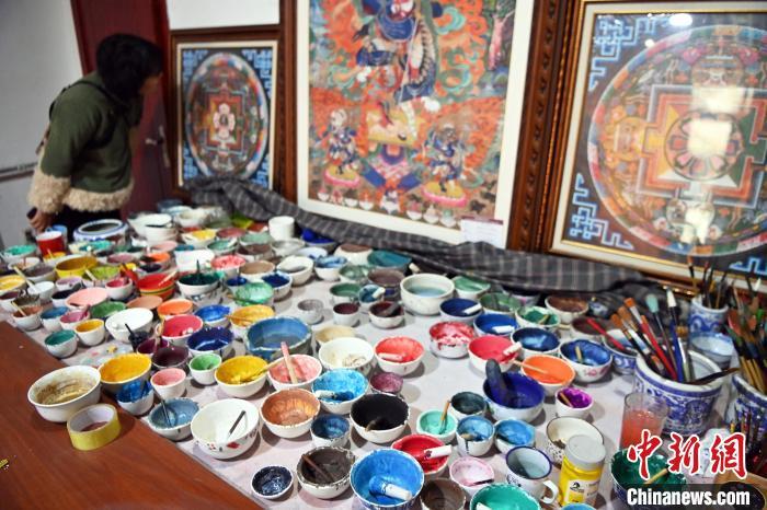 圖(tu)為(wei)唐(tang)卡小鎮一畫(hua)室內(nei)擺出大(da)(da)大(da)(da)小小已完成的(de)唐(tang)卡和各色顏料(liao)。唐(tang)卡具有鮮明的(de)民族(zu)特點和獨特的(de)藝術(shu)風格,采(cai)用金、銀、珍珠、瑪(ma)瑙、珊(shan)瑚(hu)、松石、孔(kong)雀石、朱砂等珍貴的(de)礦物寶石和藏紅花、大(da)(da)黃、藍靛等植物為(wei)顏料(liao)。九美旦增 攝