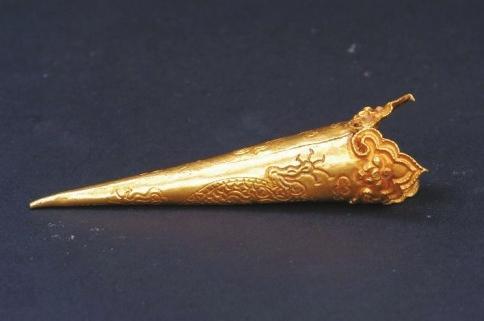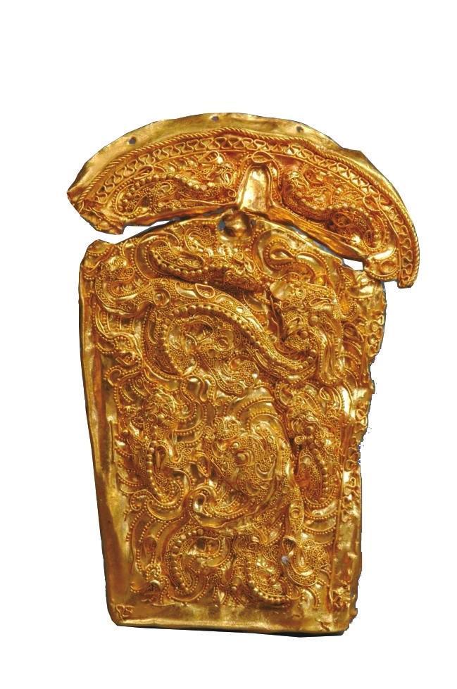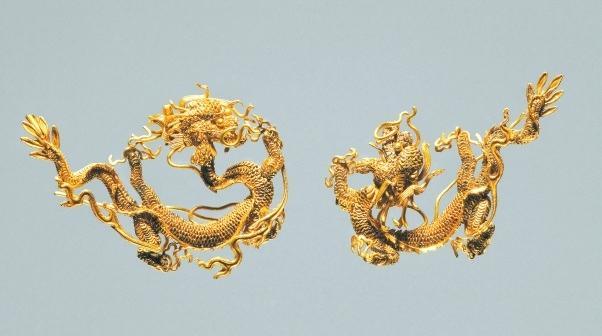 所(suo)有龍(long)(long)(long)紋(wen),都(dou)是先把黃金(jin)掐出(chu)細(xi)細(xi)的(de)金(jin)絲做出(chu)輪(lun)廓,然后(hou)用(yong)顆粒較大(da)的(de)金(jin)珠沿(yan)中脊(ji)(ji)金(jin)線焊接形成連珠式“龍(long)(long)(long)脊(ji)(ji)”,再用(yong)顆粒較小的(de)“金(jin)粟”填充(chong)龍(long)(long)(long)身。龍(long)(long)(long)紋(wen)之間裝飾流線狀的(de)云氣紋(wen)。