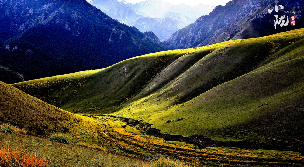 祁連主(zhu)峰在(zai)藍天(tian)白云(yun)的(de)映襯(chen)下顯得(de)肅穆大氣。周圍(wei)群(qun)峰羅列、層巒疊(die)嶂,高低延綿(mian)的(de)山脈(mo)在(zai)陽光的(de)照(zhao)耀下交相(xiang)輝映,近(jin)處(chu)的(de)群(qun)山被此起(qi)彼伏(fu)的(de)林海包圍(wei),像一道道五彩的(de)波浪,郁郁蔥(cong)蔥(cong),生機(ji)盎然。