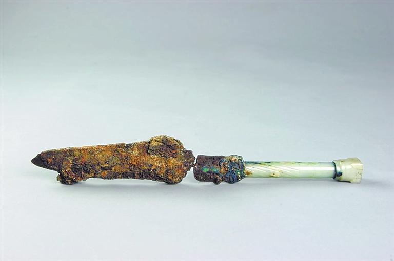 玉(yu)柄(bing)(bing)鐵(tie)(tie)(tie)(tie)劍(jian)出土于河(he)南(nan)三(san)門(men)峽虢國(guo)(guo)(guo)(guo)國(guo)(guo)(guo)(guo)君(jun)虢季的(de)(de)墓葬,全長(chang)34.2厘(li)米(mi),其中(zhong)劍(jian)柄(bing)(bing)長(chang)12.2厘(li)米(mi),劍(jian)身(shen)(shen)長(chang)22厘(li)米(mi)。劍(jian)柄(bing)(bing)為(wei)銅芯(xin),起(qi)到連接劍(jian)柄(bing)(bing)和劍(jian)身(shen)(shen)的(de)(de)作用(yong),銅芯(xin)外(wai)鑲有晶(jing)瑩透(tou)亮的(de)(de)和田(tian)美玉(yu)和綠(lv)松石(shi),并有精(jing)美的(de)(de)竹節飾紋(wen),劍(jian)身(shen)(shen)和劍(jian)柄(bing)(bing)的(de)(de)結合處也(ye)鑲有綠(lv)松石(shi)。劍(jian)身(shen)(shen)經(jing)由(you)北京科技大學冶金與材料史研究所鑒定,是(shi)由(you)塊煉法鍛制而(er)成,劍(jian)身(shen)(shen)外(wai)有絲織(zhi)品包裹的(de)(de)痕跡,應當是(shi)被絲織(zhi)品包裹后放(fang)入劍(jian)鞘(qiao)。劍(jian)鞘(qiao)則由(you)牛皮精(jing)制而(er)成。這(zhe)把玉(yu)柄(bing)(bing)鐵(tie)(tie)(tie)(tie)劍(jian)不僅制作精(jing)美,而(er)且其利用(yong)玉(yu)、銅、鐵(tie)(tie)(tie)(tie)三(san)種材料制作而(er)成,是(shi)我國(guo)(guo)(guo)(guo)目前(qian)考古(gu)發(fa)掘出土的(de)(de)年(nian)代最早的(de)(de)人工冶鐵(tie)(tie)(tie)(tie)制品。它將我國(guo)(guo)(guo)(guo)的(de)(de)人工冶鐵(tie)(tie)(tie)(tie)歷(li)史推前(qian)了近兩個世紀,被專(zhuan)家們譽為(wei)“中(zhong)華(hua)第一劍(jian)”。
