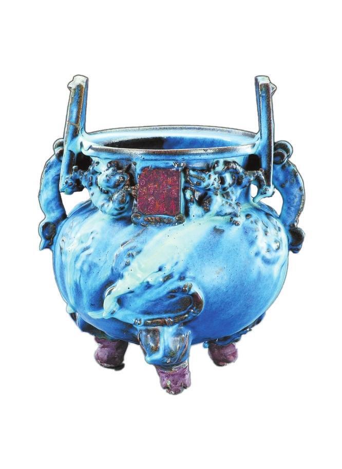 香(xiang)爐(lu)整體造型(xing)為(wei)雙立耳,圓(yuan)鼓腹,三(san)獸足,體形較大。頸部雕貼(tie)三(san)只麒麟,正面有一(yi)初方形題記,刻有“己(ji)酉年(nian)九月(yue)十五小宋(song)自造香(xiang)爐(lu)一(yi)個(ge)”共計15字,經考證:“己(ji)酉年(nian)”是公元1309年(nian),屬于(yu)元代中期(qi)。香(xiang)爐(lu)通體施天(tian)青(qing)色(se)釉,釉層(ceng)較厚,在高溫中由(you)于(yu)積(ji)釉濃(nong)淡不一(yi),縱橫流淌到器(qi)(qi)表各(ge)處,形成(cheng)天(tian)青(qing)、天(tian)藍、灰藍等(deng)不同釉面,再與紅褐色(se)的(de)露胎對比,有了銅(tong)器(qi)(qi)般的(de)金屬質(zhi)感。