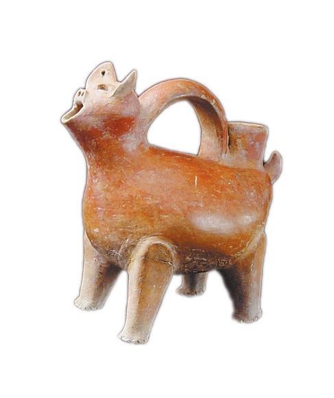 紅陶(tao)獸形壺,高(gao)21.6厘米,夾砂紅陶(tao),通體磨光(guang),遍施紅色(se)陶(tao)衣,光(guang)潤亮澤。器(qi)(qi)型圓面聳耳,拱鼻,張口,耳穿小孔,四(si)肢粗壯,短尾(wei)上(shang)翹,背裝弧形提手,尾(wei)根部一(yi)筒形注水口,嘴可往外倒(dao)水,腹(fu)部鼓(gu)起加(jia)(jia)大了容積,四(si)足(zu)立起可供加(jia)(jia)熱,使用方便,造型生(sheng)動美觀,集實用與仿生(sheng)藝術于一(yi)身(shen),是大汶口文化(hua)獨有的(de)器(qi)(qi)形,充滿了創造性(xing)的(de)靈感,是新石器(qi)(qi)時代一(yi)件難得的(de)陶(tao)器(qi)(qi)珍品。