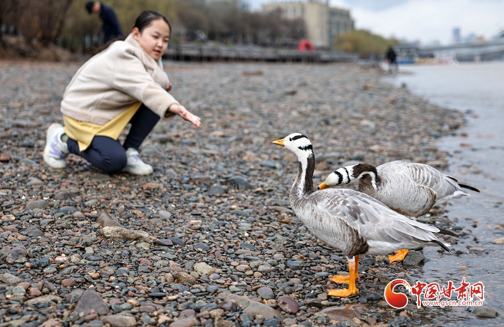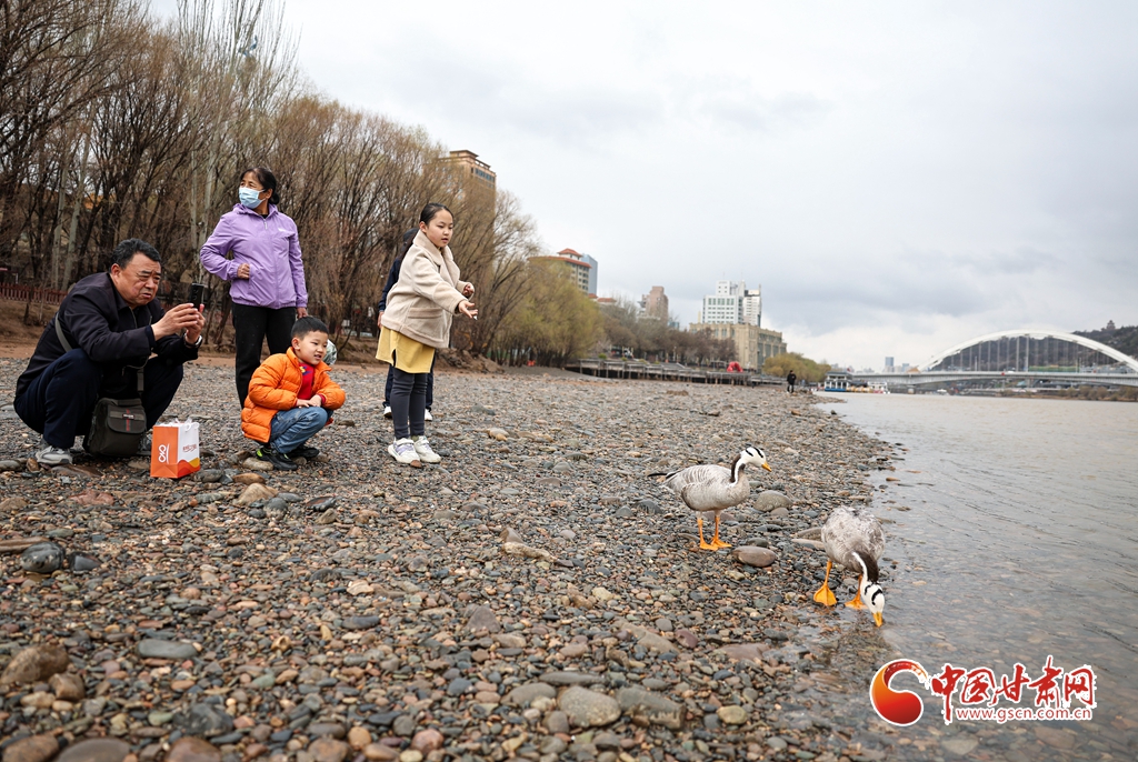 當日,在蘭(lan)州市(shi)城(cheng)關區(qu)黃河(he)河(he)畔(pan),一對(dui)斑頭雁與市(shi)民(min)溫馨相遇,吸引不少市(shi)民(min)駐足投喂,拍(pai)照“打卡”。