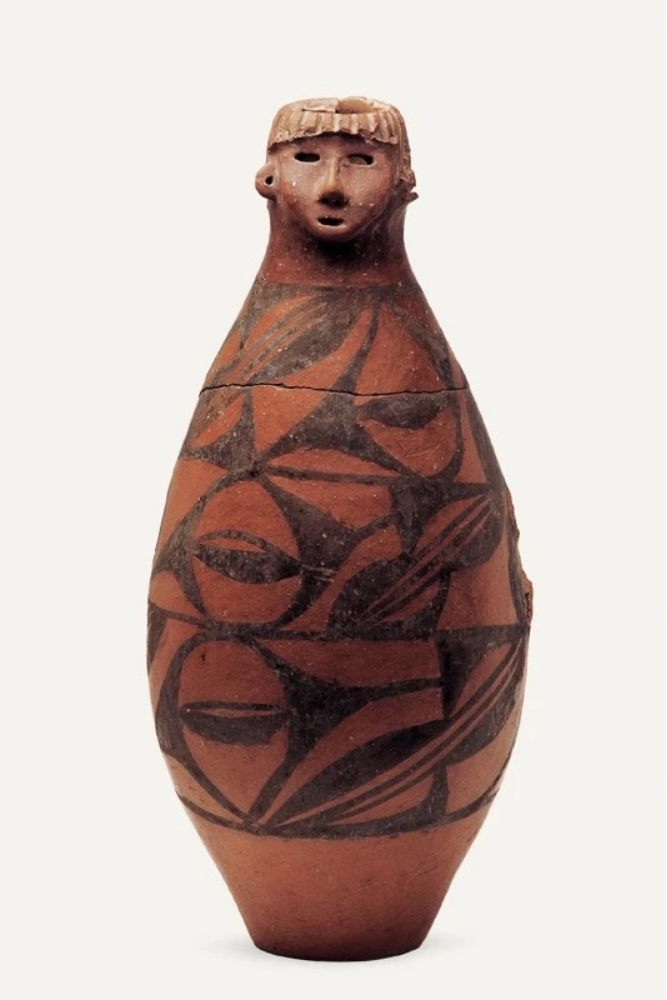 隴(long)東少女(nv)作(zuo)(zuo)為甘肅(su)的(de)(de)“顯(xian)(xian)眼(yan)(yan)包(bao)”之(zhi)一(yi),是(shi)(shi)(shi)曾在(zai)《國(guo)家寶藏》中出現(xian)過的(de)(de)“網紅”、甘肅(su)省(sheng)博物(wu)館(guan)鎮館(guan)之(zhi)寶,它于1973年從秦安縣大(da)地(di)灣遺址出土。具有(you)高度審美能力的(de)(de)“托尼”老師,設計(ji)了齊劉海發(fa)型,顯(xian)(xian)得很泰酷辣,圓鼓腹、平底(di),人(ren)們細看(kan)發(fa)現(xian),陶(tao)人(ren)的(de)(de)兩眼(yan)(yan)為圓孔洞,顯(xian)(xian)得目光(guang)深(shen)邃;鼻子(zi)呈蒜頭(tou)形,雕有(you)鼻孔;嘴較小,微微張開(kai),好(hao)像正(zheng)在(zai)言語;兩耳外展,皆有(you)穿孔;瓶(ping)體從上(shang)至下以(yi)黑(hei)彩(cai)飾三層大(da)小相同、由弧(hu)線三角紋和(he)斜線組(zu)成的(de)(de)二方連(lian)續圖案,以(yi)示華(hua)麗的(de)(de)衣物(wu)。另(ling)外,陶(tao)瓶(ping)人(ren)頭(tou)像的(de)(de)器口運(yun)用了不同的(de)(de)制(zhi)作(zuo)(zuo)手法(fa),頭(tou)發(fa)、嘴系雕刻而成,鼻、臉是(shi)(shi)(shi)捏塑(su)而成。人(ren)頭(tou)像五官整(zheng)齊、面龐秀麗,器身(shen)造型典(dian)雅(ya),與人(ren)物(wu)形象渾然一(yi)體,既(ji)是(shi)(shi)(shi)大(da)地(di)灣文化彩(cai)陶(tao)的(de)(de)代表(biao)作(zuo)(zuo),也(ye)是(shi)(shi)(shi)中國(guo)史(shi)前集(ji)彩(cai)繪、雕塑(su)與造型藝術于一(yi)身(shen)的(de)(de)杰(jie)作(zuo)(zuo)。估計(ji)任(ren)誰看(kan)一(yi)眼(yan)(yan),都會被“她”的(de)(de)神秘和(he)美麗所吸引(yin)吧。