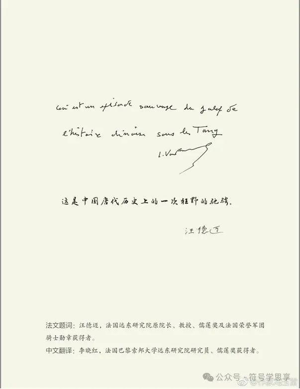 汪德邁先(xian)生(sheng)對于(yu)馮(feng)玉雷這部作品給(gei)予(yu)高(gao)度評價,2018年專門題辭(ci):“這是(shi)中國唐代歷(li)史上的一次狂(kuang)野(ye)的馳騁(cheng)。”馮(feng)教(jiao)授專門把汪德邁先(xian)生(sheng)給(gei)他(ta)的法文(wen)與中文(wen)題辭(ci)作為題簽印在書封面上,他(ta)多(duo)次跟我說:“幸遇汪德邁教(jiao)授、李曉紅(hong)教(jiao)授,受益(yi)良多(duo),感(gan)激之情,難以言表。”