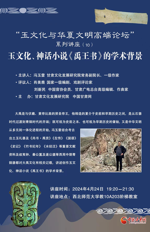4月24日晚,馮玉(yu)雷(lei)講(jiang)座“玉(yu)文(wen)(wen)(wen)化(hua)、神話(hua)小說《禹王書》的學術背(bei)景”在(zai)西北師范大學舉辦(ban)(ban)。這次講(jiang)座是(shi)甘肅(su)(su)文(wen)(wen)(wen)化(hua)發展研(yan)究(jiu)院和中國(guo)甘肅(su)(su)網聯合(he)(he)舉辦(ban)(ban)的“玉(yu)文(wen)(wen)(wen)化(hua)玉(yu)華(hua)夏文(wen)(wen)(wen)明高端論壇”系列講(jiang)座第十講(jiang),也(ye)是(shi)近期啟動(dong)的“巡禮馬銜(xian)山:玉(yu)文(wen)(wen)(wen)化(hua)與文(wen)(wen)(wen)學融合(he)(he)發展”系列活動(dong)之(zhi)一(yi),甘肅(su)(su)文(wen)(wen)(wen)化(hua)發展研(yan)究(jiu)院常務副院長、一(yi)級作家(jia)(jia)馮玉(yu)雷(lei)主講(jiang),國(guo)家(jia)(jia)一(yi)級編(bian)劇、戲劇評論家(jia)(jia)肖美鹿(lu),中國(guo)音協會員、甘肅(su)(su)廣電總臺高級編(bian)輯、作曲家(jia)(jia)劉新(xin)民擔綱學術評議嘉賓(bin)。